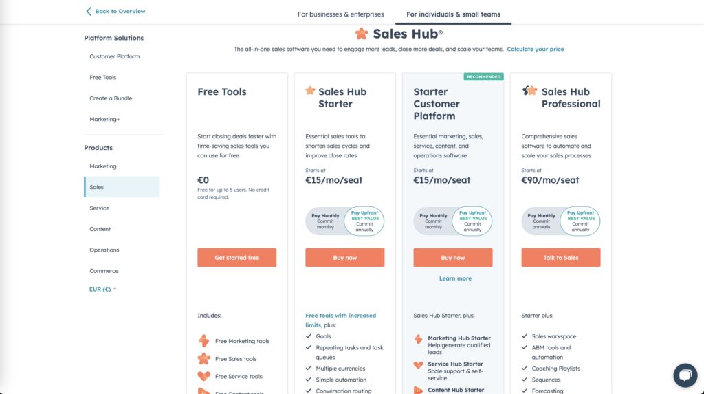 HubSpot, on the other hand, offers a free version of its CRM, which is attractive to startups, but as you grow, HubSpot’s pricing quickly escalates based on the features and users added. This can be a drawback for startups on a strict budget.